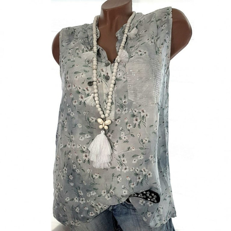 Blusa sin mangas para mujer. Corte holgado y cómodo con escote con cuello y cierre de botones. Estampado colorido con motivo floral. Disponible en dos variantes.