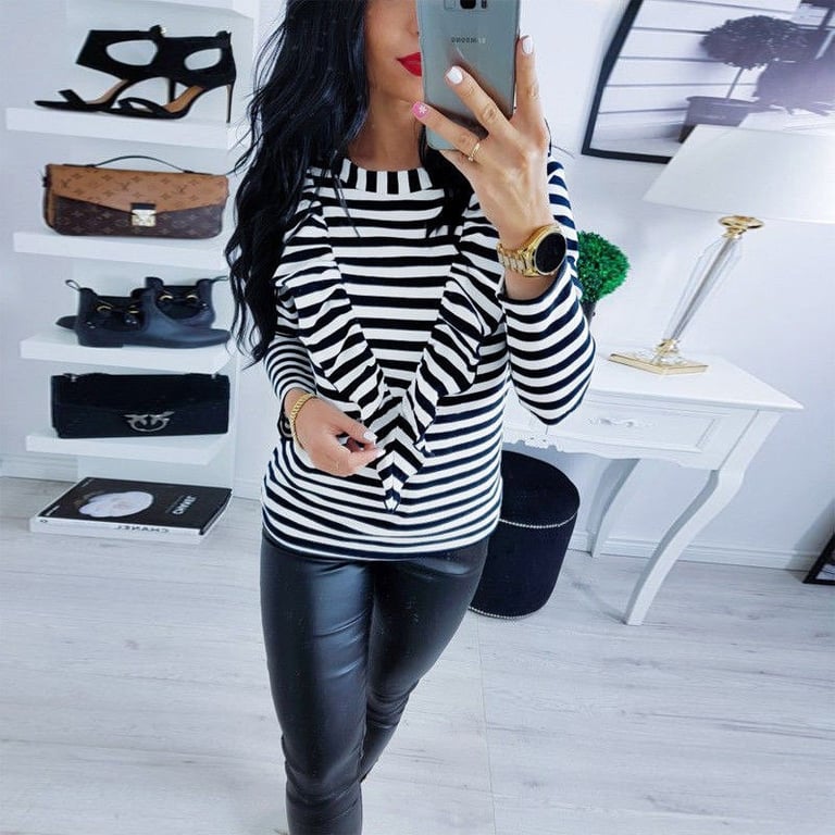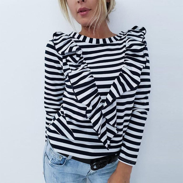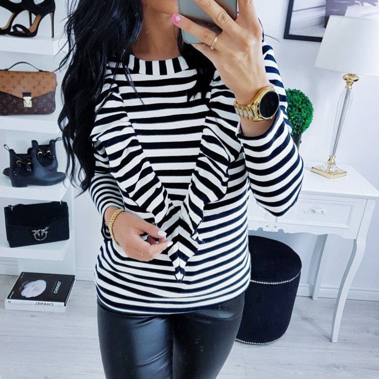Camisa de mujer de manga larga con escote redondo. La camiseta tiene un patrón a rayas y la parte delantera está adornada con un volante. Disponible en dos variantes.