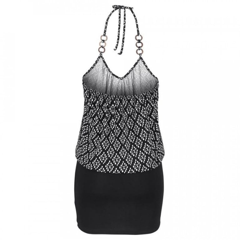 Vestido de mujer con falda corta ajustada y parte superior suelta. El vestido tiene tirantes delgados decorados con anillos y un lazo en la parte posterior del cuello. Estampado en blanco y negro con patrón.